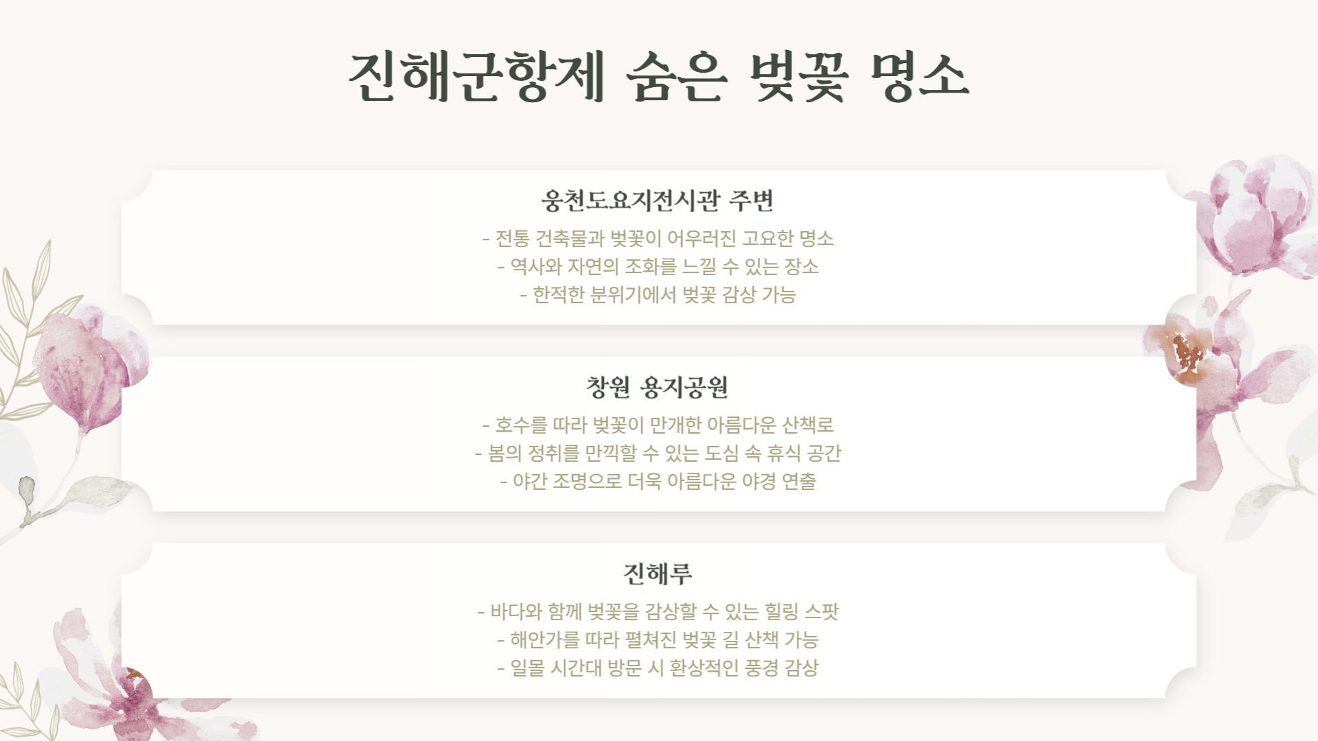 올봄, 벚꽃과 함께하는 특별한 순간을 진해에서 즐겨보세요. 다양한 행사, 아름다운 풍경, 그리고 따뜻한 봄바람이 여러분을 기다립니다.