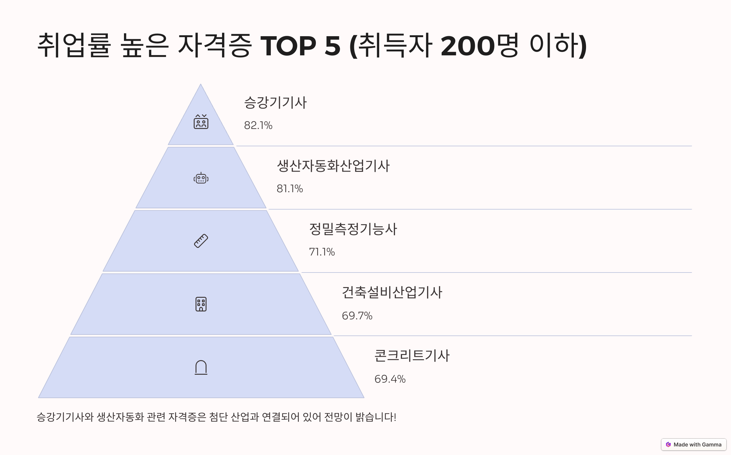 순위자격증명취업률 (%)1위 승강기기사 82.1% 2위 생산자동화산업기사 81.1% 3위 정밀측정기능사 71.1% 4위 건축설비산업기사 69.7% 5위 콘크리트기사 69.4% ※ 승강기기사와 생산자동화 관련 자격증은 첨단 산업과 연결되어 있어 전망이 밝아요!